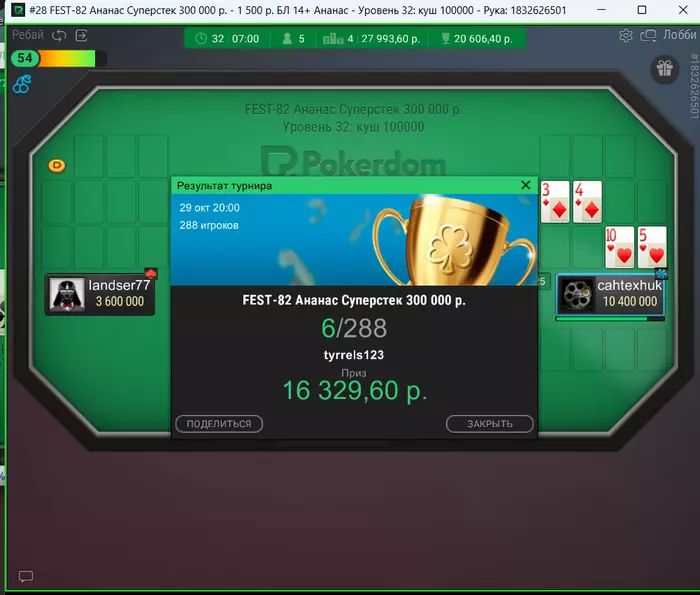 Тот турнир, который мне покорился, по началу был тем в котором складывался меньше всего. Пока шла лейт рега, никак не получалось раскрутиться, за столом сидел лютый вип, который коллил олины от мин ноков по 64о и т.д. и занести никак не получалось. В итоге, я сделал финальное реентри с 10 бб, ни на что особо не рассчитывая, считая что если удастся досидеть до мин кеша уже повезло. Но неожиданно турнир пошел и скоро я уже сидел с топовым стеком. На стадии 2 столов, я стал пробивать оппов по лидерборду и путем нехитрого подсчета, пришел к тому что для того чтобы тащить лидерборд надо брать топ-3(был еще дип sgeee в мейне, который в теории мог позволить меня обойти если я не возьму топ-1).