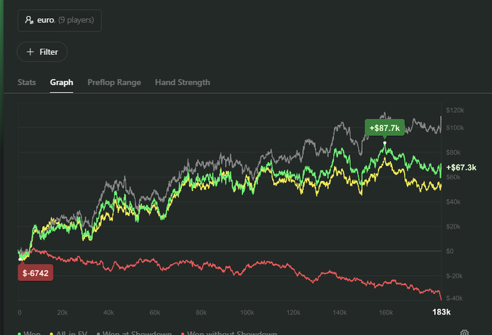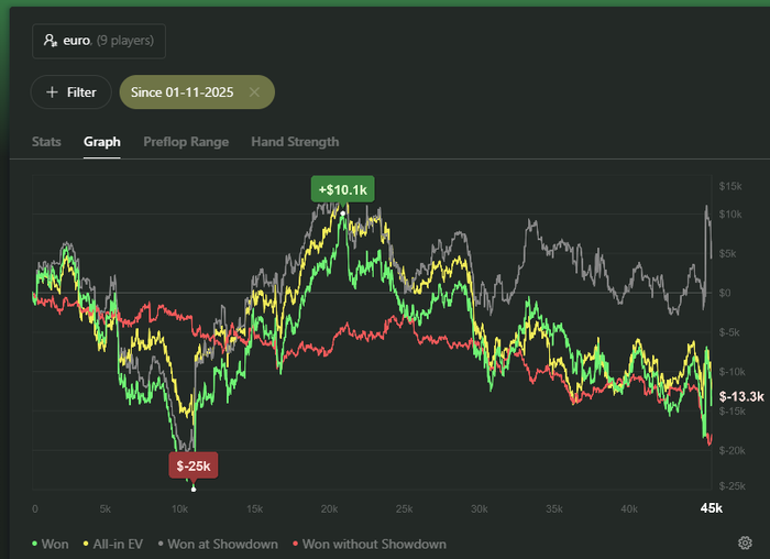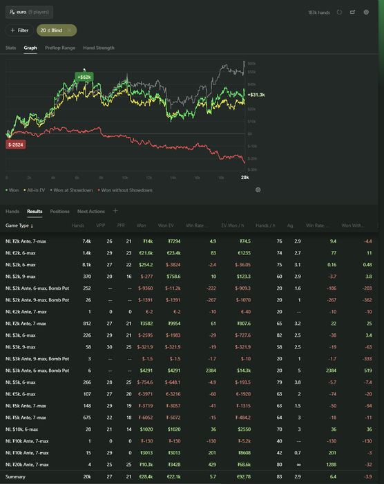 Доволен тем, что начал пытаться лезть наверх, получилось сыграть 20к раздач. Но буду достаточно объективен, селект на этих лимитах был хуевенький, достаточно часто проскакивали игры на впне с -10 фишом и тд. Хуета полная в общем, от этого в будущем очень хотел бы отказаться.