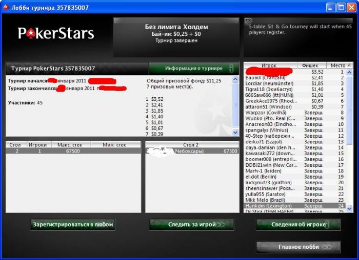 Сегодня вышел в офф, сыграл турнир за 3К рублей...Структура просто сказочная для Чебоксар-15К фишек начальный стэк, первый уровень 25/50, блайнды по 15 минут(обычно у нас в городе начальный стэк 7К при первых блайндах 100/200 )...Набралось три полных стола...Поначалу сидел нормально, по-тихоньку наращивая стэк...Затем случилась забавная раздача-с катоффа самый фишной фиш за столом лимп, с батонна один из немногих понимающих игроков изолирует рэйзом 1200(блайнды 150-300 вроде), я делаю 3бет 3700 с ББ с ...Фиш фишной делает колл, понимающий баттон скидывает...На флопе я делаю контбет в 2К(пот больше 8К), так как видел фолды этого парня на крошечные ставки постфлоп после захода под огромный рэйз...На терне приходит ,чек-чек, бланковый ривер также прочекали...Опп перевернул ...Я конечно понимаю, что мои любимые карты это натс, но не в такой же ситуации...Осталось у меня около 8К...Блайнды росли, карты не было, и наконец при уровне я вижу в своих руках AQ на баттоне(стэк также около 8К) Опен-рэйз с УТГ в 1800, УТГ+1 колл, я радостный пуш...Игрок на большом блайнде, промолвив "Намечатся интересная раздача", уравнивает мою ставку, оставляя в своем стэке 5К...УТГ также делает только колл, УТГ+1 также коллирует...На флопе ББ запихивает свои огрызки, УТГ пихает свой большой стэк, УТГ+1 также запихивается...У ББ-, УТГ-, УТГ+1-...Терн и ривер меня не усливают...Вот так играют в нашем городе...