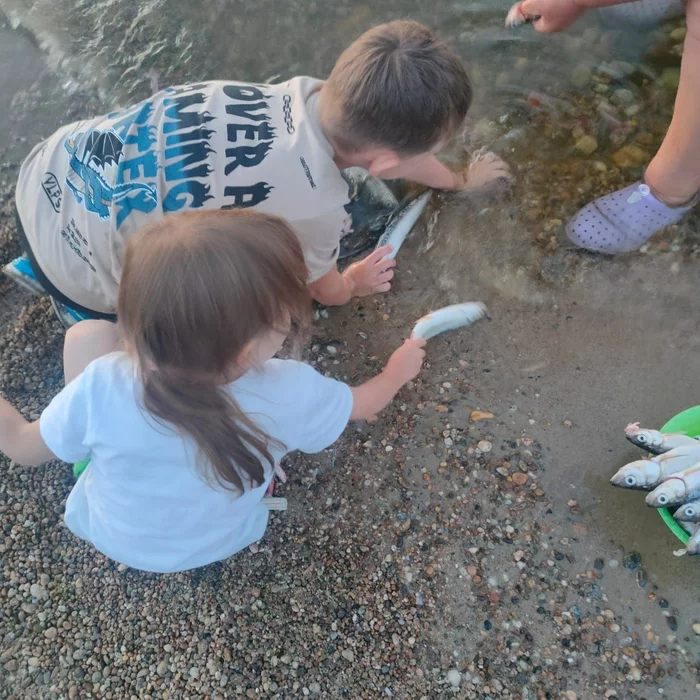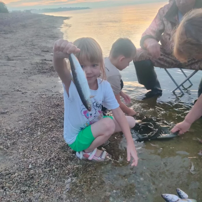 Ну здесь гранатовый песок, встретили каких-то знакомых, поприставали к какому-то рыбаку, шашлык, вечер у костра, ночь в палатке. Даже искупались. Но об этом я узнала только вчера от детей)
