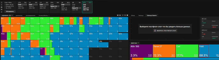 А далее уже на глаз оперирую. Например вс фиша будет велью + мерджи под 100%, а блефов 0. Оверфолдер с низким 4бетом буду юзать все по немногу ( что бы не был 3бет 20%+). Если это бот, который и 4бетит часто, и не сдается, то весь диапазон буду занижать кроме велью. Ещё коннектора могу оставить в блефе, т.к. они на 4бет могут дефиться. И все в разрезе конкр. раздачи на "глаз" или по "чуйке".