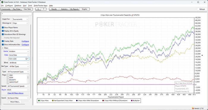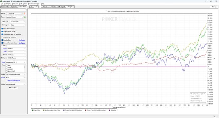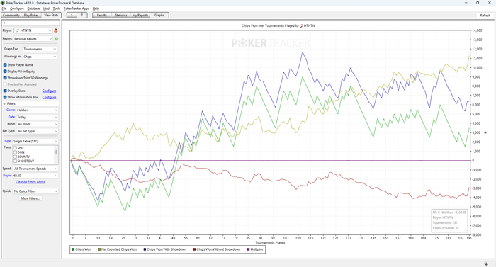 Думаю сегодня поиграю побольше, хотя бы 250 турниров. Сейчас очень доволен своей формой, думаю должно получиться закрепиться на десятках. Месяц, конечно, очень трешовый, я буквально каждый день улетаю в минуса. Хорошо хоть сначала случился лучший месяц в жизни, а потом происходит худший а не наоборот) Ну и в целом, конечно, не страшно, наконец то вступление в пул оправдает себя, тем более уже скоро выплата)