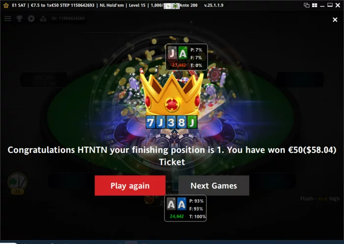 Параллельно сыграл один тикет за 7.5, с него получилось отобраться в турнир за 50 евро. Оказалось это еще одна сателитка в целевое событие за 300, наверное сыграю ее сегодня.