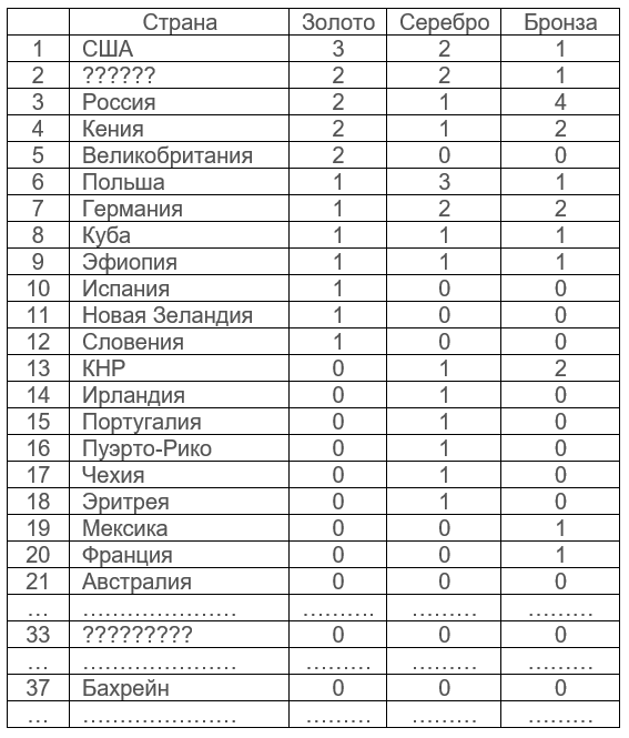 Ответ: Ямайка, Аргентина. Комментарий: 5:0. Ямайка сильна своей спринтерской школой. При равном количестве наград команды располагаются в алфавитном порядке.