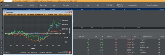 Замечательная сессия. Точнее сказать, очень поучительная. И очень приятная в эмоциональном плане, так как сделал то, что было нужно, новое. Как говорится, вся соль была в работе над текущей ситуацией. Дисциплина: 5+. Встретился с неприятной ситуацией, потильтовал конечно по старой схеме. Но по скиллу, перерыв сделал, подумал, что делать. Понял, что показываю С-game. Остановил сессию, начал писать профиль C-game из того, что сам заметил и все раздачи разобрал, которые были на первой половине сессии. Подробно. Сделал вывод, на что нужно уделать внимание на C-game. И продолжил играть - качество поднялось, по диспа так же держала. Сделал после 1 часа видео перерыв продолжительный. Потом сел еще на 1 час с видео. И качество стало минимум на крепком B game. Короче говоря, моя цель о подтягивание C-game к B-game реализуется. Очень порадовало, то, что все само сложилось и вспомнилось об этой цели, и я не забыл об этом, и сделал и рад! Качество: [C] [C-]...[C+][B+], сначала как обычно C-game подтянуло тильта)), но после грамотного перерыва, B-game уже тянуло С-game. И С-game рада, этому факту :D. Тильтоустойчивость: 3. К регам предвзято отношусь. Нужно относиться к ним с уважением. И если они неплохо играют, то примерно тратят на работу над игрой примерно столько же сил, сколько и я. Кто-то меньше, кто-то больше, но это в любом случаи заслуживает уважения. Поэтому не нужно злиться, когда тебя на скилле развели )), ведь покер - это игра разводов по большей части. ) Мотай на ус если что, или просто nicehand скажи. Зачем вести себя как идиот? Диспа: Не очень. Кол-во: 47/380/2000 (январь). Думаю с учетом того, что я играю 6 часов, и с учетом того, что был вынужден делать перерыв и прорабатывать ситуацию (анализ c-game, и запись видео), на которое ушло тоже 3 часа. Считаю, что момента халявы с моей стороны здесь не было. +3 часа завтра отыграю :)).