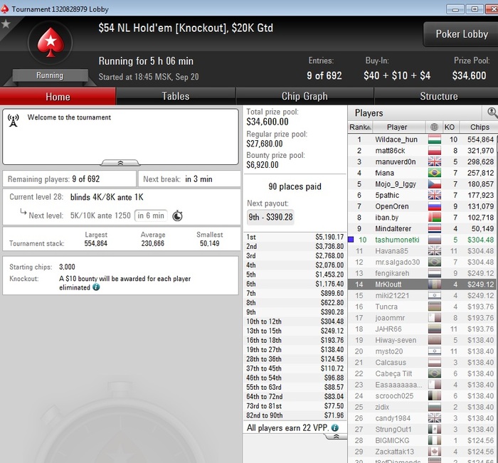 На мальту не втащил ниодного по 82 сата, было только 3е место 125 евро дали. Решил зарегаться в 11 фриз сат к сату на багамы (2 путёвки по 320 давали и 3е место 280 баксов). В общем думал над тем, что бы вылететь третьим забрать 280, но был чипаком, подумал, что может это шанс? Взял путёвку за 320 прыгнул в турик к лакбоксам, шёл чипаком, но две раздачи сожгли 320 баксов. КК<AQ и почти сразу же AQ<A9