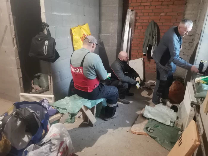 Пошли на этаж! Там тоже все захламлено-час чистили и растаскивали всякие материалы которые мешали нашим стенкам!