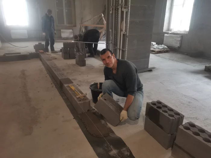 Выходит прораб и ставит задачу-надо разместить целый этаж - по 2 ряда блоков скц! Ого, мы думали чего то доделывать, мелочи и тут объем большой выходит! И надо все сделать сегодня-завтро приедет телевидение и будет съемка! 🤣