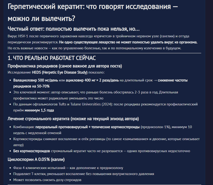 Убрали часть медикаментов, добавили парочку новых (в том числе те самые кортикостероиды, которые рекомендовала ИИшка). Уточнил по режиму. Работать можно и даже нужно! Видимо ограничения были, когда глаз был красным и сильно слезился, сейчас вроде как наоборот его полезно нагружать. Гулять тоже можно, просто без фанатизма ну и при хорошей погоде. Соответственно, сразу два особо гнетущих меня фактора сняты.