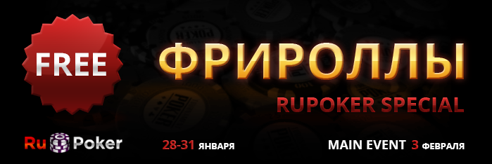 Специально для наших игроков с 28 по 31 января на RuPoker пройдут бесплатные турниры с призовым фондом 2 000 рублей каждый и 3 февраля основной турнир с гарантированным фондом - 15 000 рублей!