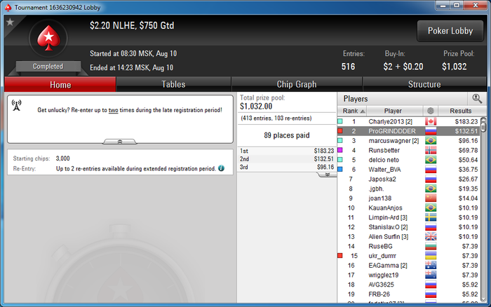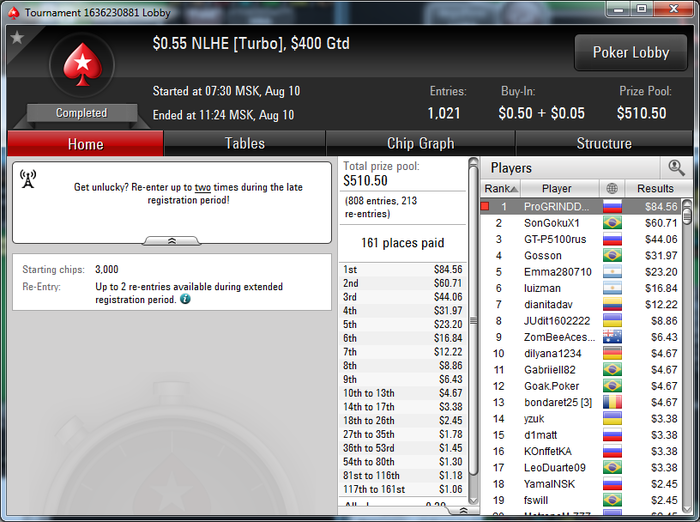 Poker Stars $4.00+$0.40 No Limit Hold'em Tournament - t3000/t6000 Blinds + t500 - 8 players
