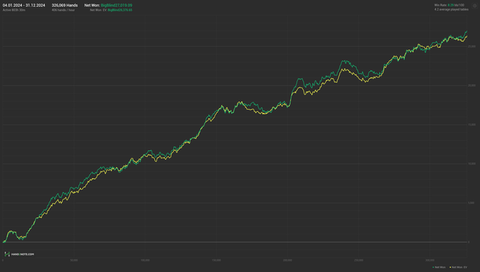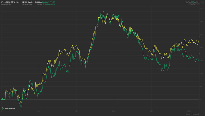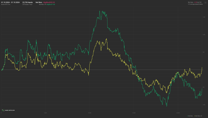 По психологии показал свой лучший месяц в этом году. По уровню игры определенно нет. Из-за микса лимитов и румов за результатами уже дня через 3-4 уследить нереально, а после середины месяца мозг не может даже прикинуть идешь ты с профитом 1к+, 2к+, 3к+ или че там ваще. Вроде понимаешь, что выше 0 и всё.