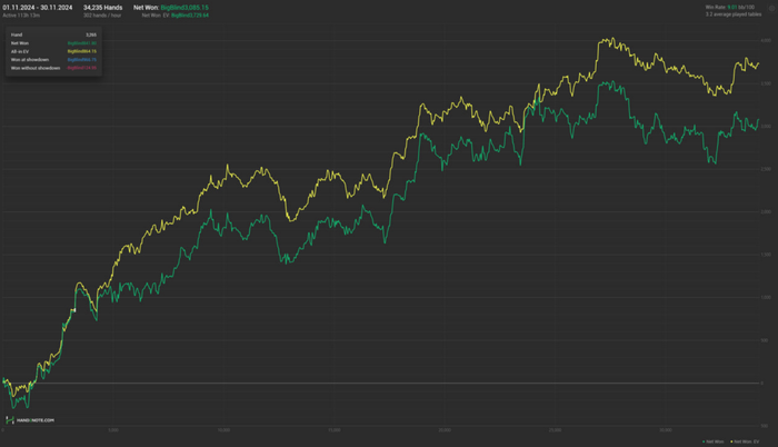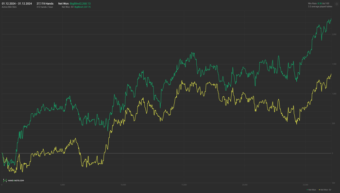 5. Показать в целом хороший покер. Возможно из-за монотонности и отсутствия понимания результатов скатился в какой-то автопилот с собиранием комбинаций. По итогам месяца показал ввсф 43, намного ниже обычного, хотя в моменте казалось, что играл нормально. Базу свою проанализировал, выводы сделал, в декабре постараюсь слабые места подтянуть чуток, чтобы такого не было. Но справедливости ради даже с такой откровенно автопилотно-пассивной игрой удалось показать 10евбб.