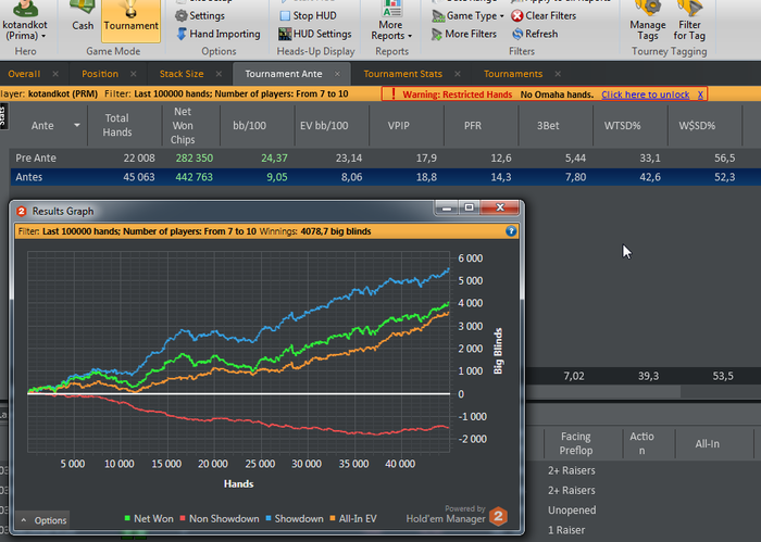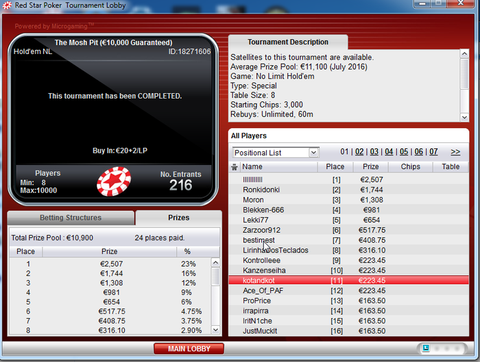 Prima, $10 Buy-in (50/100 blinds, 10 ante) No Limit Hold'em Tournament, 7 Players
