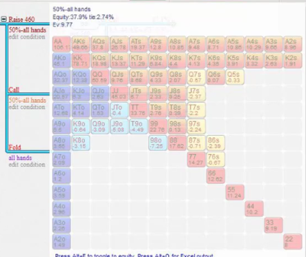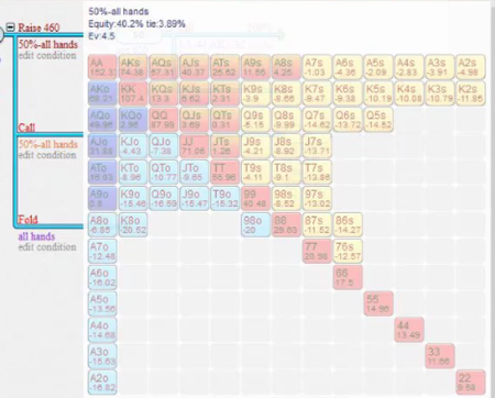 Теперь уменьшим сайзинг 3бета до 2х, не изменяя его рэндж. Тогда ожидание нашего 4бетпуша снижается.