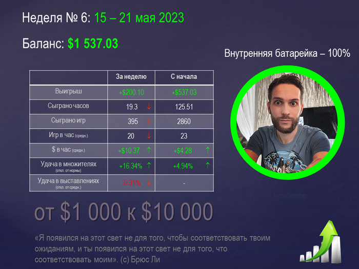 3 неделю подряд делаю >+$400, даже несмотря на такие выходные. Помогли хорошие множители и добрые ребята за столами.