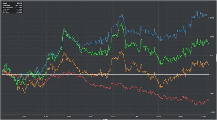 Помимо того, что график нулевой, думаю, что многие обратили внимание на красную и синюю линию, а самые догадливые уже поняли, по какой причине я не выигрывал! Если очень коротко: приемы с высоких лимитов, балансировка, блефы, хиро-коллы и прочее «г…ГТО» НЕ ПРИМЕНИМЫ ДЛЯ МИКРОЛИМИТОВ! А по красной линии вы видите, как я чекто заблефовывал и вскрывал оппов на Нл5, только красная - это, к сожалению не зеленая.