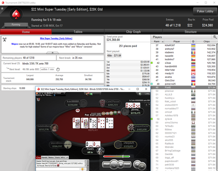 Ну а напоследок, так скажем, ПС уже решил посмеяться надо мною, на тебе дорогой следующей же рукой 88, 18 бб у тебя, заопенпуши их сразу и посмотри на АА конечно же, тупо сидел минут 15 смотря в монитор, все переваривал, не мог понять, зачем я это все сделал, гг хули. Так скажем себя я уже морально отчитал, выводы сделал, тенденция в общем положительная, евешку жрём, работаем дальше, надеюсь в дальнейшем такой хуйни не будет