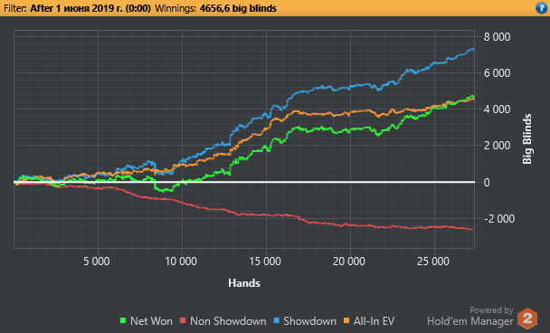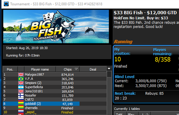 P.S. Самое главное, что отыграл психологически устойчиво, тильта почти не было, делал то, что должен был, а диспа вернула уже в Крыму, втащил BigFish за 5.5$). Так что поездку отбил с лихвой. Осталось для галочки втащить за 16.5$ (тут я только второй был), да и за 33$ BigFish уже тоже в трофеях!