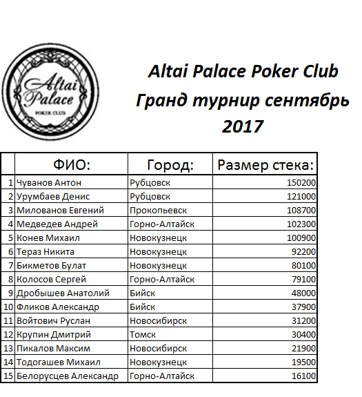 Уважаемые члены Покерного клуба Altai Palace, перед вами список тех, у кого есть билеты на предстоящий Special Freeroll. Состоится он 24-го сентября. Минимальное кол-во участников 4