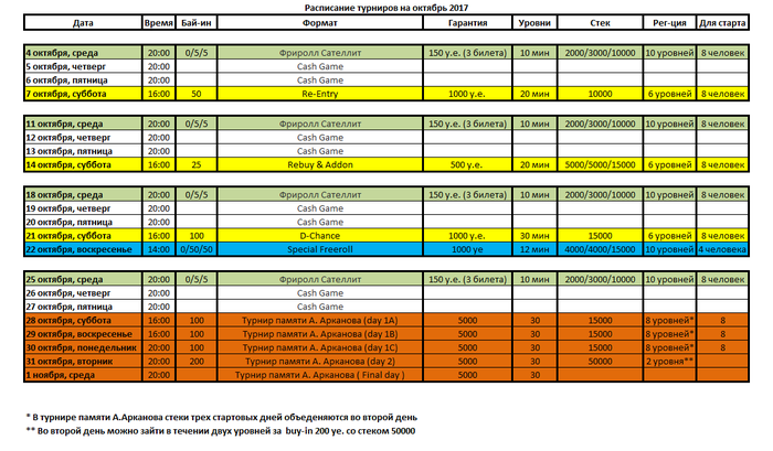 Октябрь мы делаем акцент на кэш игру. В октябре игроки смогут использовать свои турнирные доллары на кэш игре! Так же, будет запущен Бэд бит Джекпот - накопительный призовой фонд, который будет выплачиваться пострадавшему игроку, если у него в кэше проиграла рука от фулл хауса на королях и выше. Подробности акции чуть позже. Ну и нельзя не отметить многодневный турнир в конце месяца, посвященный памяти Аркадия Арканова. Известный писатель и сатирик, который очень любил покер и даже пытался реабилитировать его в 2009 году, создав фонд в поддержку спортивного покера. Так же, с 29 октября по 3 ноября у нас пройдет крупный шахматный турнир с призовым фондом 1 миллион рублей, посвященный так же Аркадию Арканову. Мы спланировали расписание так, что участники шахматного турнира смогут совмещать эти два мероприятия.