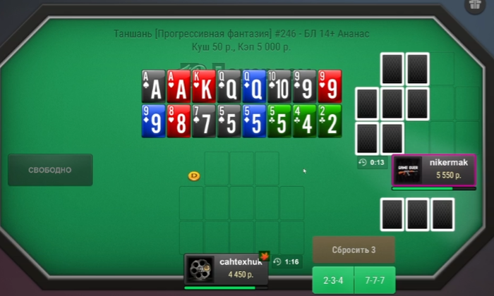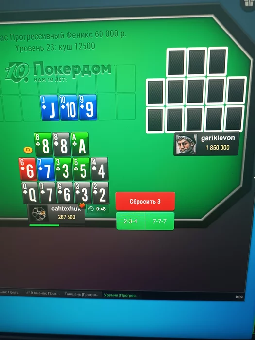 Кто нибудь знает процент выпадения повтора на тузовой фанте?! Я отвечаю за 5.5 часов катки на 30 фант(20 тузовых) 1 дохлый повтор... Еще умудрился около 0 закончить кэш игру. Я не думал, или не знал,что такое вообще бывает....