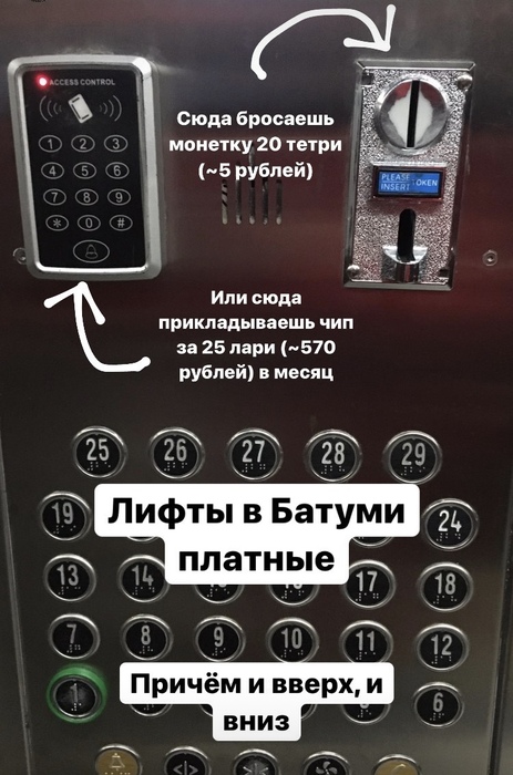 Ещё один интересный факт о жилье в Грузии - платные лифты. Ты покупаешь безлимитный чип на месяц или платишь разово, просто закидываешь монетку в специальный разъём прямо в лифте. Причём оплачиваешь проезд как вверх, так и вниз. Стоимость везде разная. В моей последней квартире в Батуми безлимитный чип на месяц стоил 25 лари (560 руб./7,5$), а разовая поездка 20 тетри (4,5 рубля).