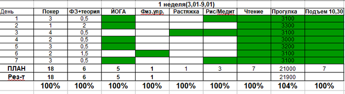 1. Покер 3,5-4 часа, теория/ФЗ 1,5-2 в день. 2 выходных в неделю