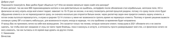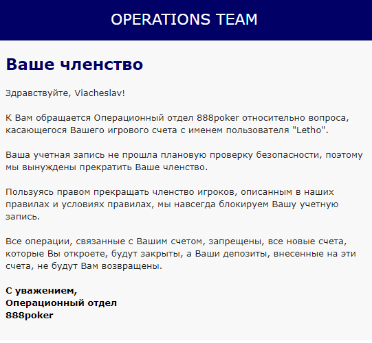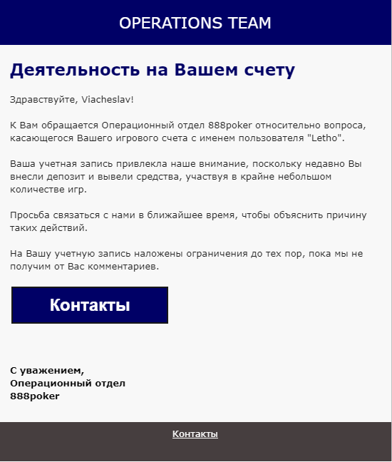 Сегодняшнее утро оказалось очень веселым. Обрисовываю ситуацию: посоветовался с тренерами школы, посоветовали сделать депозит на 888, я сделал депозит 7500$. Начал играть, с лейаутом очень неплохо выглядит новый клиент, нормальное поле, только была одна проблема у меня постоянно зависал и падал клиент: по 10-15 раз за сессию, а когда пытаешься перезагружать, он не запускается сразу, а вылетает белым окном, которое тоже зависает, в общем после месяца-двух меня это доконало, я решил что мне не комфортно так играть. Это меня сбивает, поэтому решил вывести большую часть и оставить минимальную часть своей загрузки на 888. Поставил на вывод 7000$. Приходит такое письмо на почту.