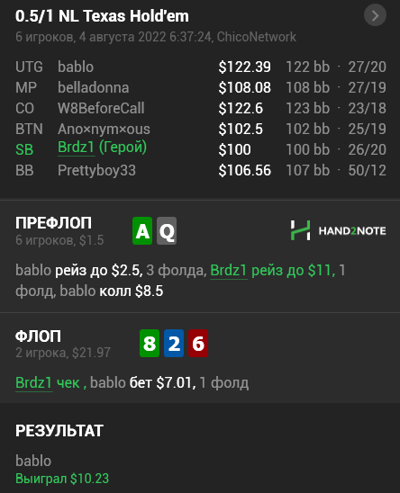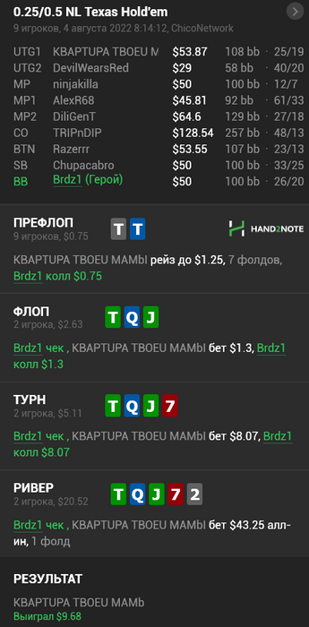 На последней секунде таймбанка не успел докрутить 0.60бб на слайдере, в итоге офк ривер чёрная и я не получил ев. Ну и бог с ним, у меня этого ев столько уже...