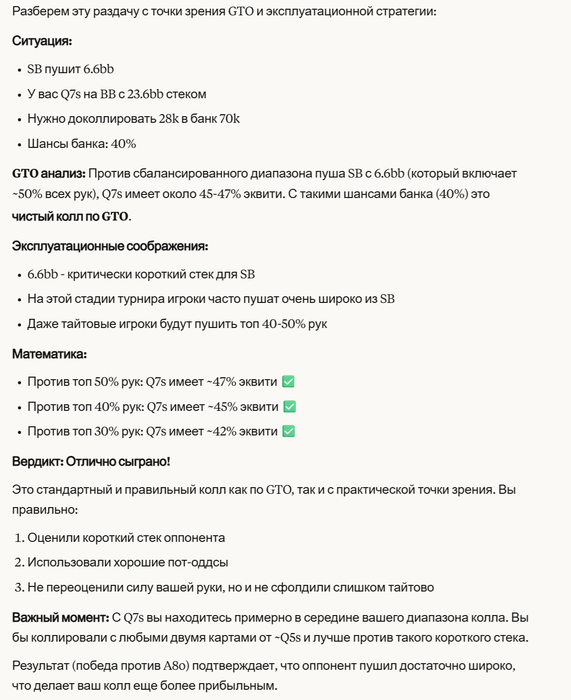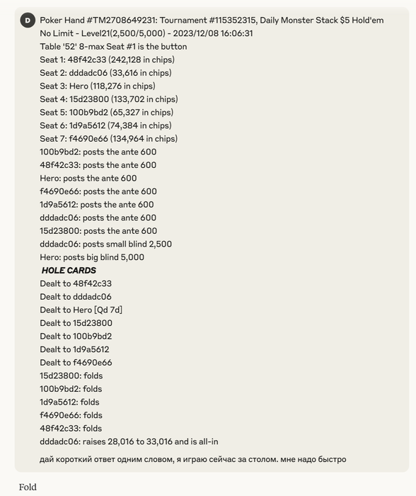 Вообще эти все gpt говорилки очень неплохой тест дают, который правда для некоторых оскорбительно обидный. Если ты считаешь, что в чём-то на самом деле разбираешься, то тебя скорее всего не будут устраивать ответы нейросети. Можно для примера загрузить разбор любой раздачи в самую топую LLM (которая думает :) ) и попросить оценить. Типа дать все вводные которые были за столом, статистики, нотсы... А, что там? покер очень сложный? нейросеть ему не учили? Ну конечно, а квантовой физике учили ))))