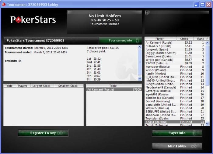 Poker Stars $0.25+$0.00 No Limit Hold'em Tournament - t10/t20 Blinds - 9 players -