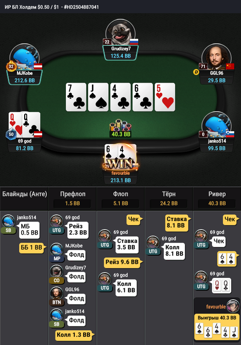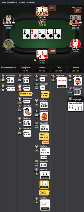 Или он просто рандомно жмякает на кнопки 😆 Сидел с валетами/дамами, после ставки в 25% поставил тебя на АК - туз и король недошли - он "Ура, мы пушим, гнутся шведы". Но в таком случае не исключаю что он бы на твой пуш на терне скинул. Но тут на флопе нужно было напугать.