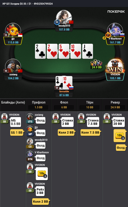 Или вот тут, тоже рука от Fizz. Проследи его линию, как префлоп коллера, посмотри на доску. Он достаточно убедительно изобразил оппоненту сильный диапазон, на совершенно подходящей для этого доске и с подходящими ранаутами.