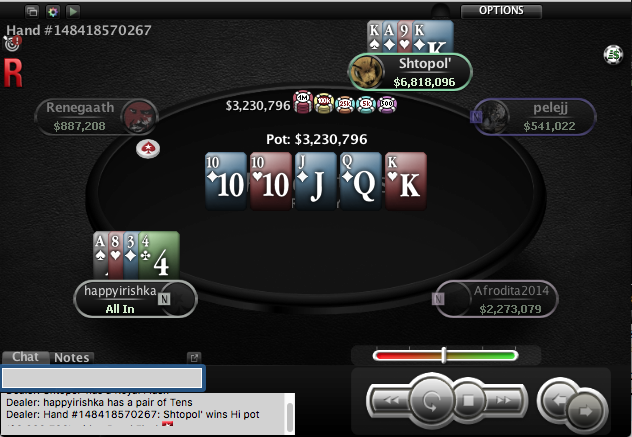 а теперь пло! в последнее время я больше внимания уделяю этой игре, видимо хайла совсем поднадоела, особенно пот лимит. и работает, ройку поправил прилично. был бы выбор - катал бы хайлу только нл и желательно турбо и 9 макс пло в любых стеках и по фиг турбо или нет. ну короче..