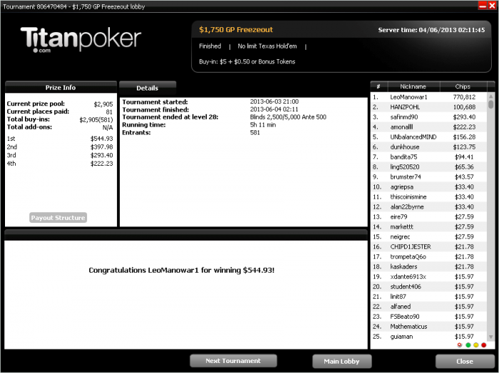 Вчера сходил покатать в оффлайн, занял второе место в турнире. Приз небольшой, чистый доход чуть меньше $200.