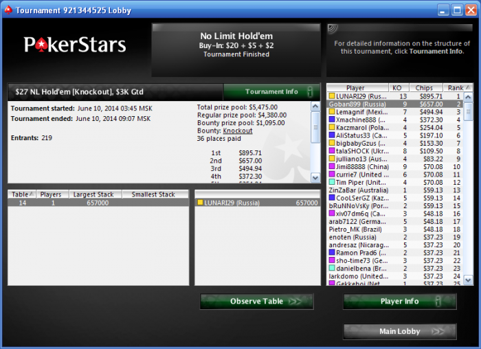 Poker Stars, $10 Buy-in (3,000/6,000 blinds, 750 ante) No Limit Hold'em Tournament, 5 Players