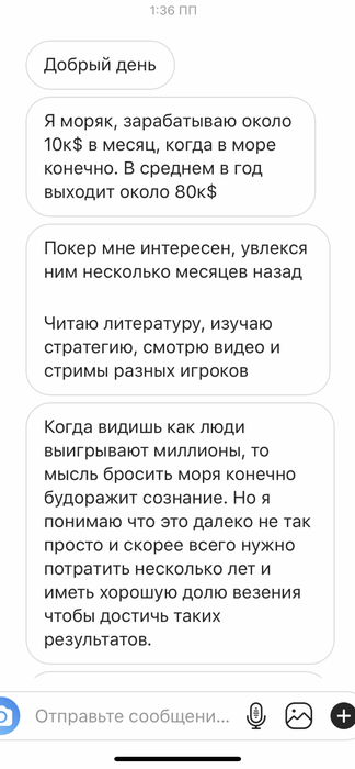 Другое дело, что покер едва ли ему поможет, потому что увлекшись покером "несколько месяцев назад" и в довольно уже зрелом возрасте шансов хоть как то приблизиться к привычному морскому доходу очень и очень мало. Это относится не только к покеру, а в целом основная проблема моряков, когда пытаешься оставить море, но понимаешь, что условные 8-12к в месяц (говорю про офицерский состав) на суше ты не можешь заработать и отправляешься в очередной рейс.