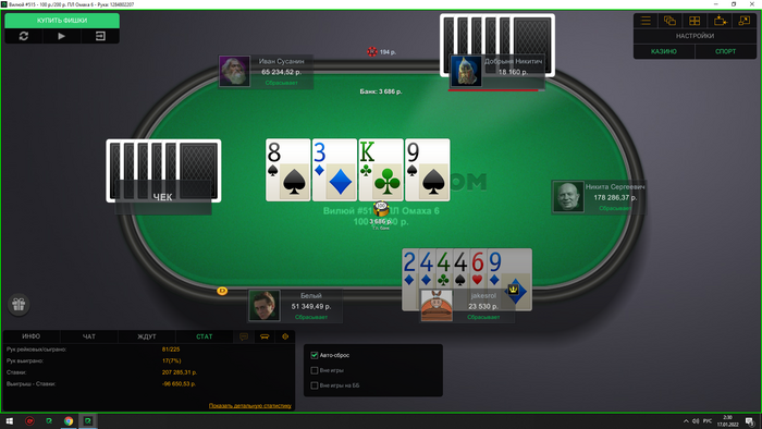Вчера проебал 180к на хай лимитах,сегодня немного даже получилось отбить на 250-500.Решил еще ночью под фиша сесть,в итоге фиш справа от меня