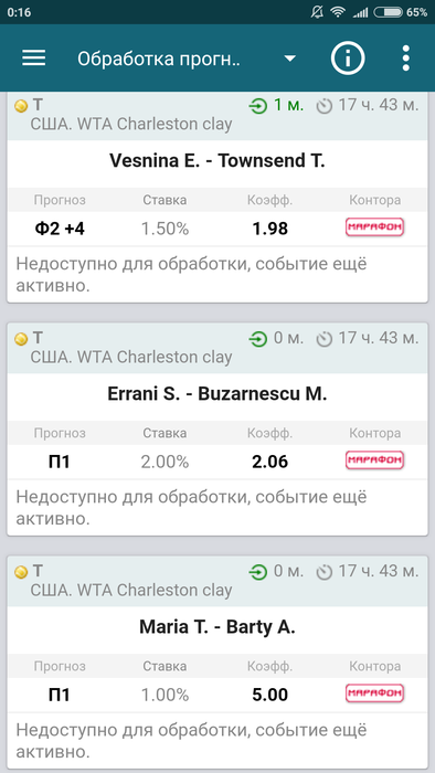 82. Siegemund L. - Osaka N. П1 2.50% 2.66 Pin 83. Gavrilova D. - Giorgi C. П2 3.00% 1.81 Pin 84. Bertens K. - Krunic A. Ф1 -4 2.00% 1.83 Pin 85. Bertens K. - Krunic A. С форой по сетам Ф1 -1.5 2.00% 2.02 Pin 86. Begu I. - Liu C. Ф2 +5 2.00% 2.04 МФ 87. Vesnina E. - Townsend T. П2 1.00% 3.13 МФ 88. Vesnina E. - Townsend T. Ф2 +4 1.50% 1.98 МФ 89. Errani S. - Buzarnescu M. П1 3.00% 2.06 МФ 90. Maria T. - Barty A. П1 1.00% 5.00 МФ 91. Arruabarrena-V. L. - Keys M. П1 1.00% 3.64 Pin 92. Arruabarrena-V. L. - Keys M. Ф1 +5 2.50% 1.75 Pin 93. Bertens K. - Krunic A. Ф1 -4 2.00% 1.90 Pin