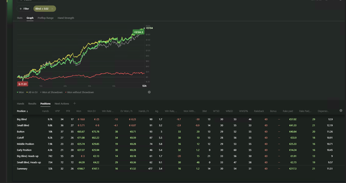 Свежие графики только с нл2, к сожалению, на котором я прорабатываю свои ментальные проблемы , но даже тут лузрейт уже выше, чем на скрине выше, а по росту лимитов будет расти (лузрейт) ещё сильнее. По ощущениям, на нл20 будет в размере -25-30бб / 100.