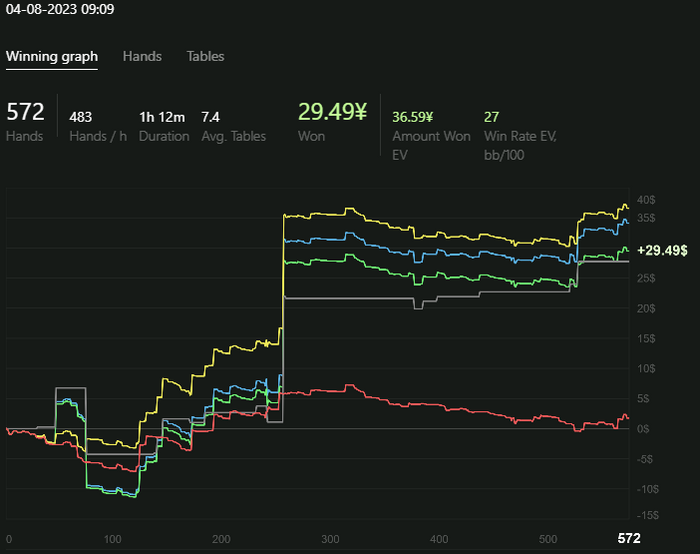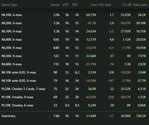 На прошлой неделе на завод практически не ходил, поэтому выкатывал минимум 2к рук в день. Лимиты нл10-20, ананас 10-20, немного нл40(мало столов и бр не такой глубокий), plo4Hi 10, plo5Hi 10-20, так как в plo с селектом попроще. На нл10, plo10 стараюсь играть в дипах. В среднем 8-9 столов.
