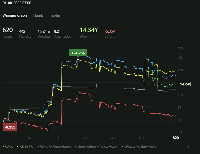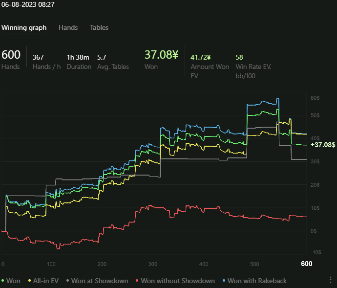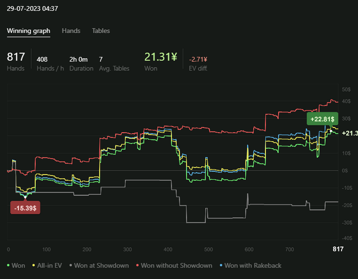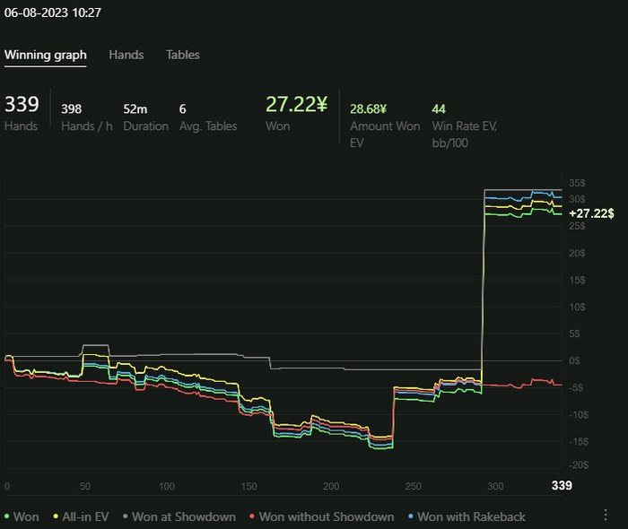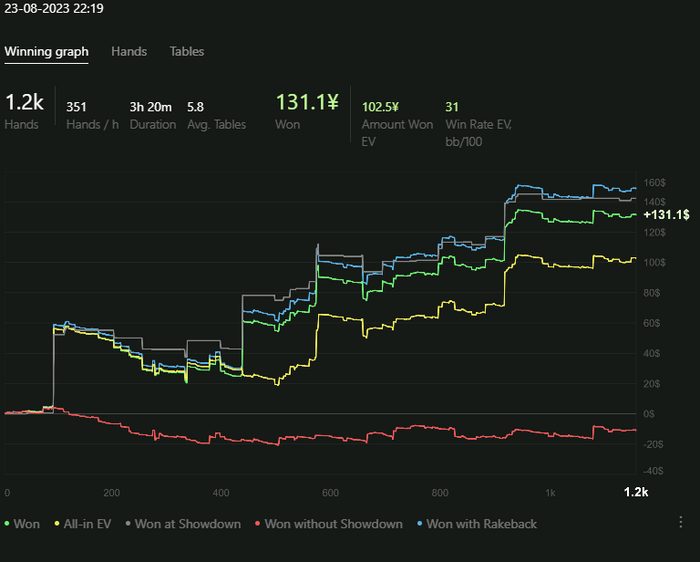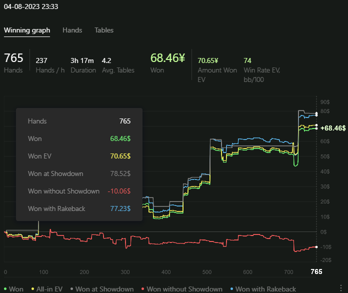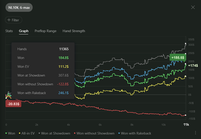 В H2N4, кстати, нравится то, что на графике можно в дополнение к трем классическим линиям посмотреть на четвертую - "Won with Rakeback". И тут все по прежнему - за 1к раздач выходит в среднем $10 РБ.