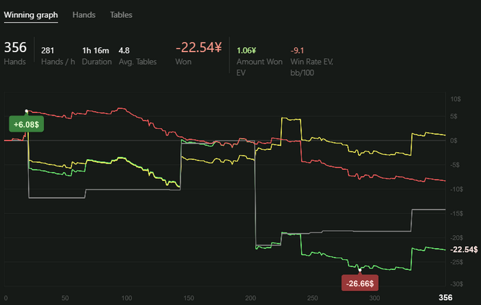 Эта дистанция была откатана с 20 числа. При этом я припоминаю всего пару сессий, в котороых загрузка состояла исключительно из нл10. Был постоянный микс лимитов и дисциплин, так что $246 c РБ с 9.3EVbb/100 при неполной занятости в покере и при катке 6-10 столов (кто пробовал приложухи, тот поймет) - пока что неплохой результат! Еще около $50 профита именно с нл10 не трекнулось со столов со страддлом.