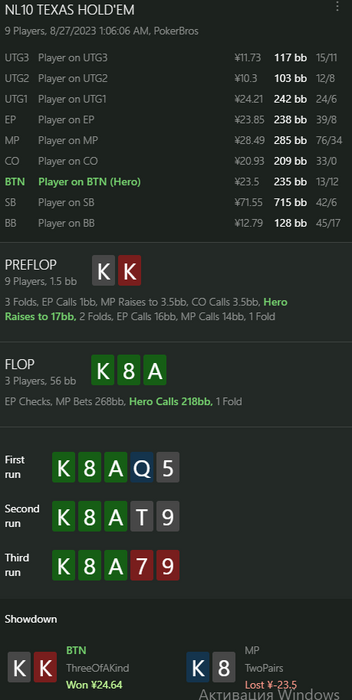 Затем еще через несколько кругов, когда трое удалились (кого-то обнулили, кто-то ушел в закат со стеком в 600бб) и образовался горячий 3-мах удалось эти 200бб из Подольска вернуть обратно: https://s.pokerbros.net/?t=piucvief002en