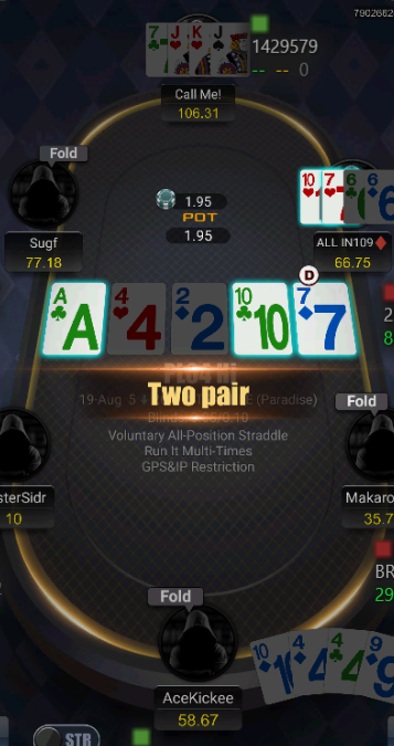 После обеда поехал на работу и так как в транспорте особо заняться нечем, решил посмотреть что там творится в одном из клубов. Столов было мало, собрал микс на 4стола из нл10-20 и....PLO6 cards c двойным бордом .....и бомб-потами! Полчаса околонулевого перекидывания фишек завершилось тем, что именно в тот момент, когда мне нужно было выходить, почти параллельно случаются две решающие раздачи: