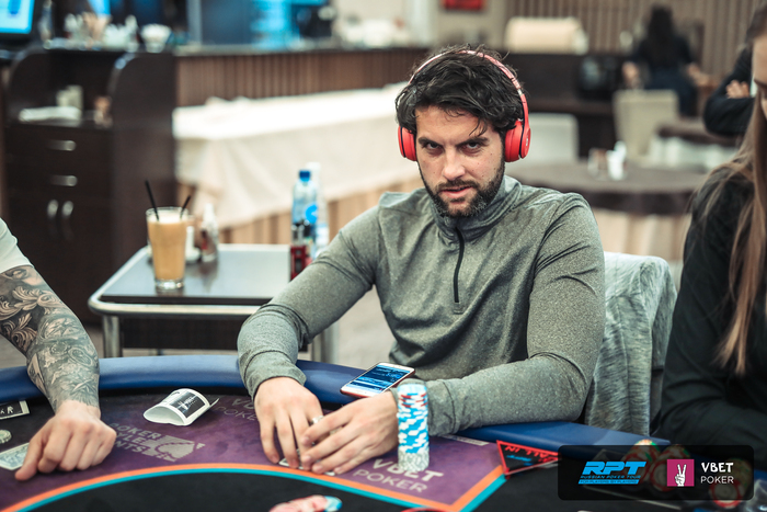 Игорь Жигунов едет на со стеком более 200К против Георгиоса Цолофтаса. Доска , у Цолофтаса в стеке примерно под 1КК уже. Половина всех фишек турнира точно у него.