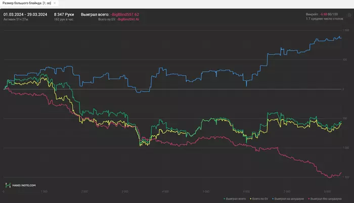 Доволен, что хотя бы не в минус. В скором времени планирую собирать свой собственный рабочий сетап, поэтому надо поднажать в следующем месяце, а то такие результаты никуда не годятся. Устроил бы марафон с ежедневными отчетами, да не особо это на меня работает, только стресса добавляет от подотчетности и обязаловки. Просто скажу, что постараюсь быть более consistent. Очень часто слышу это слово от зарубежных тренеров и контентмейкеров, когда речь заходит о достижении успехов в покере.