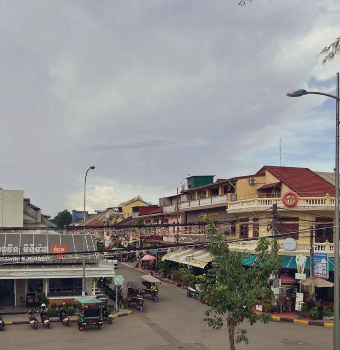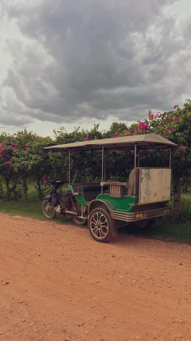 Итак, мы сели в свою первую в жизни моторикшу. Надо сказать, что Камбоджа - единственная страна с четырехколесными тук-туками: коляску просто прикрепляют к байку. Такая конструкция, пожалуй, сказывается на общем вайбе. Рикши, которых мы видели во Вьетнаме и Малайзии, стараются украшать свои салоны иллюминацией, игрушками, аудиосистемами. В камбоджийских же тук-туках все по хардкору: ветер свистит в открытых окнах, а занавеска затыкает открывшийся от удивления рот. Иногда место водителя отгорожено от салона решеткой: пассажир как будто в автозаке. В общем, Катя не советует ездить на тук-туке после парикмахерской.