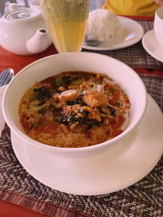 Мы заказали пасту с крабовым мясом и амок – легендарный камбоджийский суп с кокосовым молоком, который мы уже пробовали днем ранее в классическом рыбном варианте. Крабовый вариант также оказался достойным. Еды нам показалось мало, и мы взяли в соседнем стрит-фуде салат с папайей и солёными крабами. Во время ожидания познакомились с мальчиком 4-5 лет, с которым вместе начали бросать камни в воду с высокого обрыва. Правда, сначала он хотел бросать эти камни в нас, но ему запретили родители.